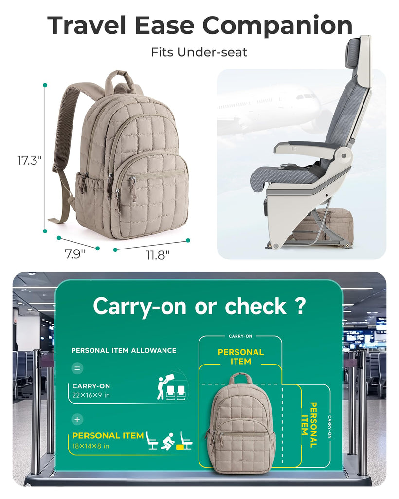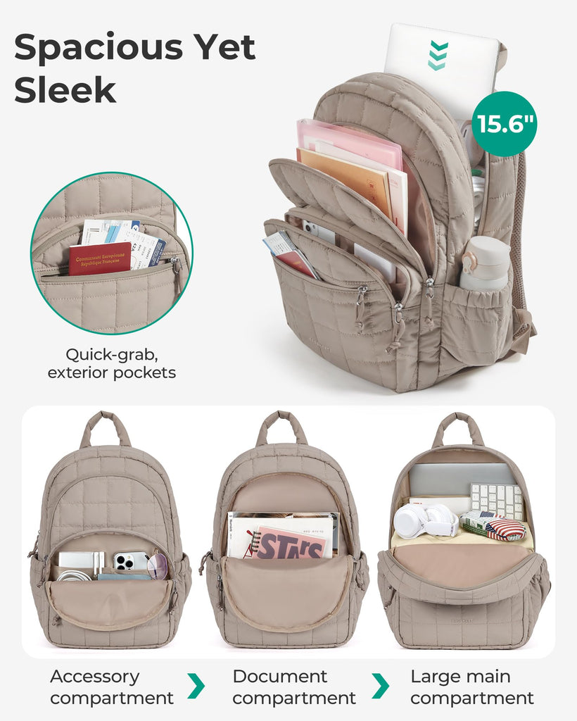 BAGSMART College Laptop Backpack, Travel Backpack for Women, Quilted Casual Daypack, Water-Resistant Bookbag for 15.6 Inch Laptop, Camel