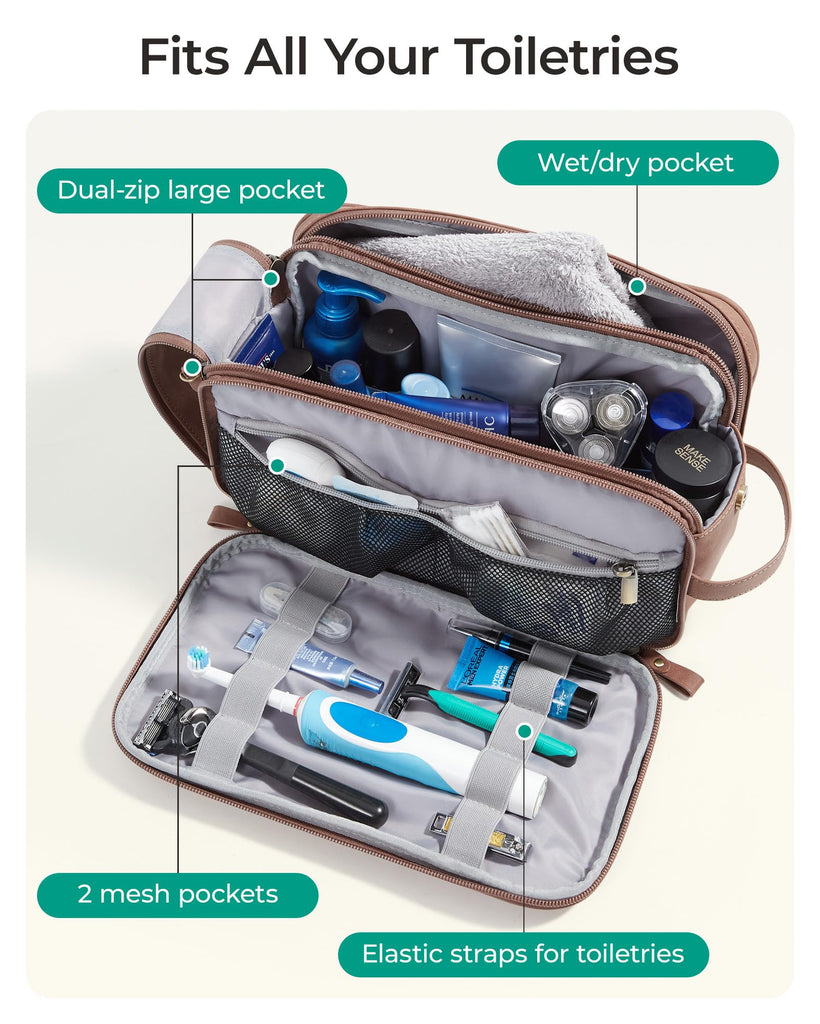 - ThouMulti-purpose Toiletry Organizer: This toiletry bags for traveling will meet your needs, for all trips, long or short and you can drop all skincare products, like larger bottles, sewing kits, perfume, and moreghful Features: Dopp kit is equipped with a sturdy PU leather handle, smooth-gliding zippers, and a reinforced snap-fastened base to accommodate all your storage needs