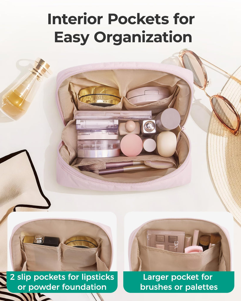 - Smart Compartments, No Chaos - 2 snug pockets keep lipsticks upright & a larger pocket protects brushes – everything stays put in this cosmetic bag for women, even on bumpy roads