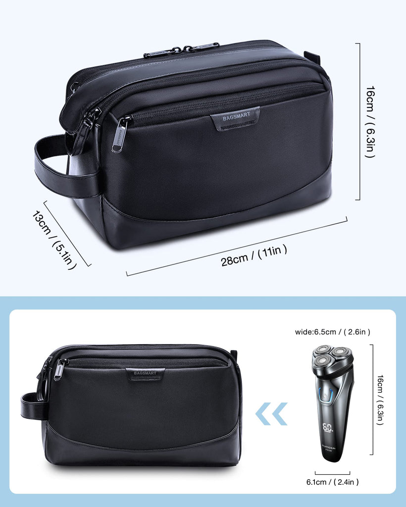 Brand: BAGSMARTColor: BlackFeatures: Premium Material: This men toiletry bag is made of water-resistant material with PU leather, which can keep upright at any time. Water-resistant, not easy to get dirty, you can directly wipe the surface to keep it clean Large Capacity: The interior of the travel bags for men...