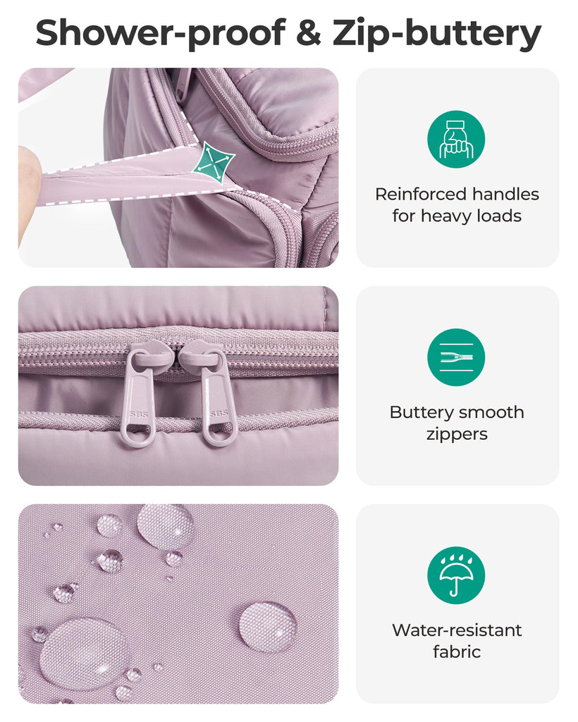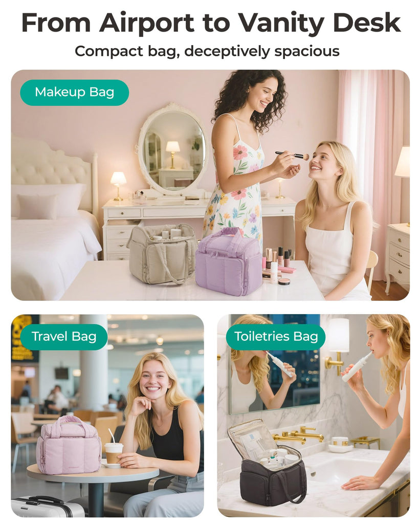 - Puffy-Soft & Leak-Resistant: Crafted with cloud-soft polyester (just 0.55 lbs—lighter than your phone!), this toiletry bag tucks easily into your carry-on. Its water-resistant shield handles bathroom spills, surprise rain, and leaks from other bottles. Helps keep your essentials dry on the go so you can travel with peace of mind!