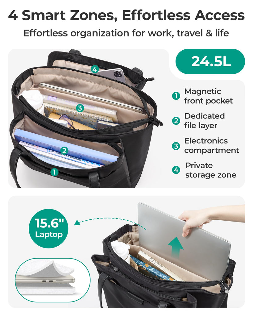 - Smart 4-Zone Organization: The capacity of this large tote bag is 24.5L. Dedicated 15.6" laptop compartment, document organizer, and quick-access essentials pocket. Front magnetic closure pocket for instant retrieval of keys/phone/passport/sunglasses