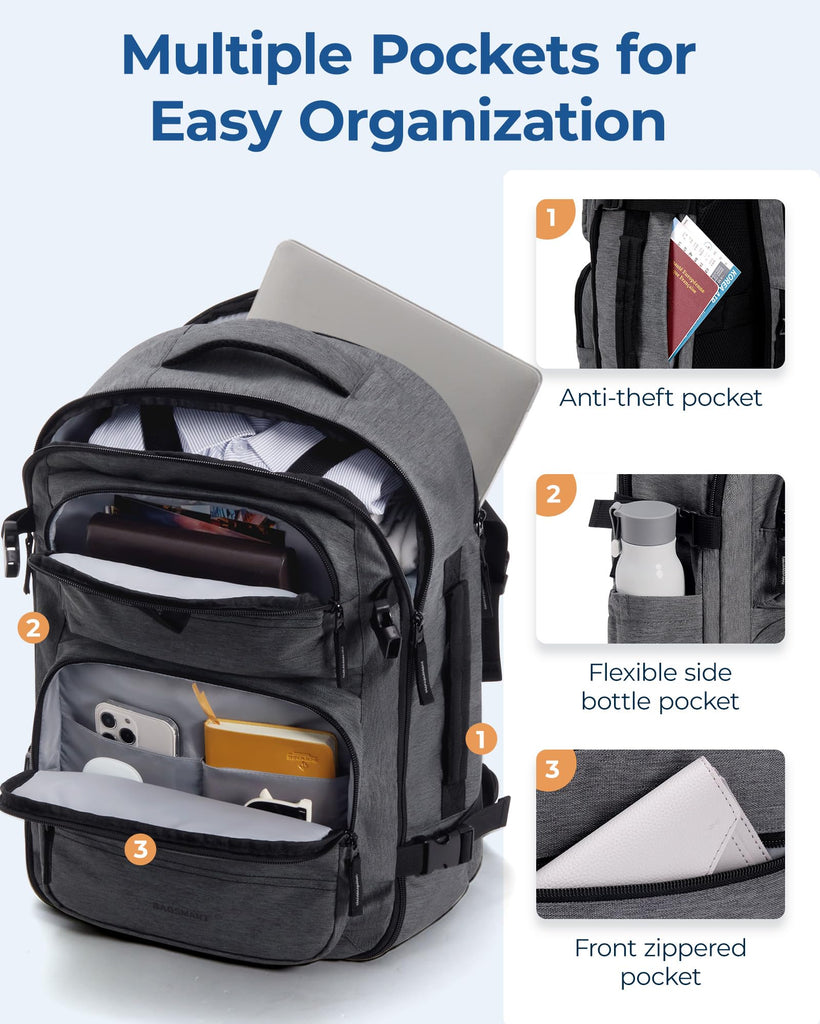 - Spacious & Multi-Compartments: BAGSMART Travel Backpack is a versatile carry on backpack that features a generous size of 18.1" x 12.6" x 7.5" providing a whopping 40L capacity. With multiple compartments including a Top external zipped pocket, zippered bottom pocket, front zippered pocket, separate laptop compartment, and bottle pocket, this backpack is a perfect companion for travelers seeking efficient storage solutions