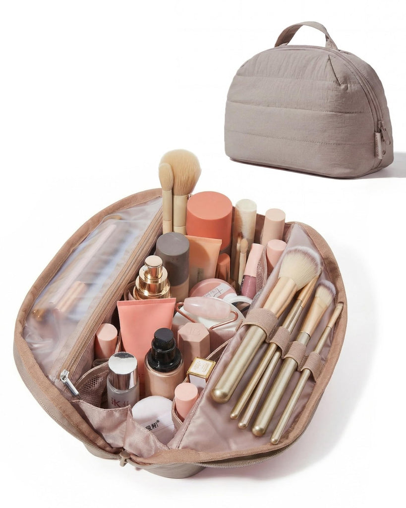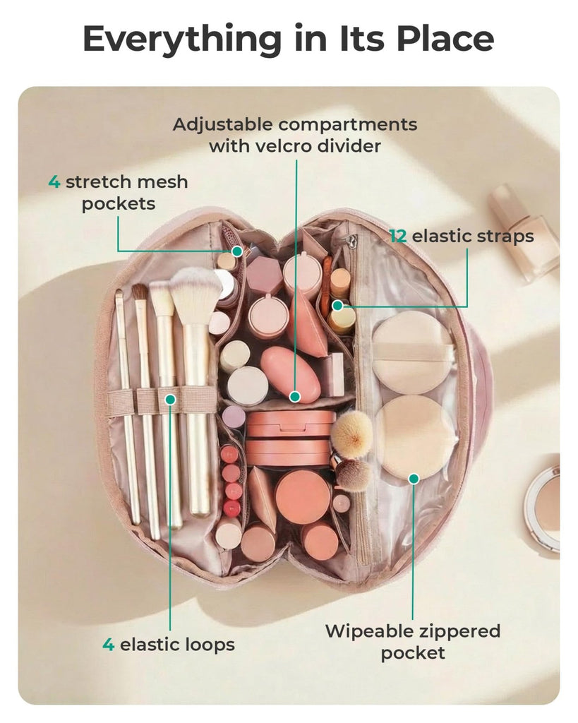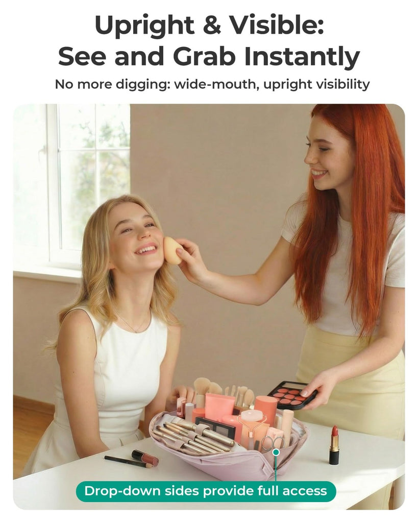 - 【Instant Access, Zero Mess】Unzip, unfold, and see your entire collection at a glance. This makeup bag's wide fold-down design transforms your routine, making airport security a breeze and hotel vanities instantly organized. No more frantic digging—this cosmetic bag lets you grab what you need and go