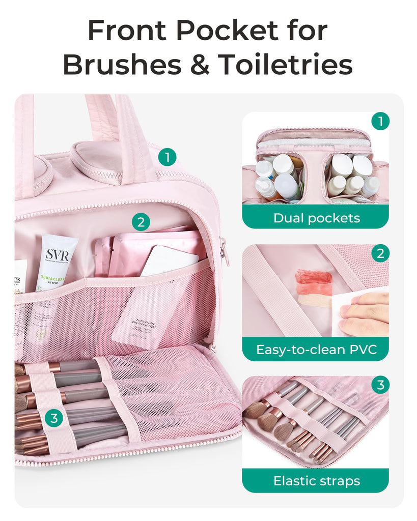 - Easy Access and Keep Upright : Full opening and not piling up for easy access to items. Double side full open design of travel bag for toiletries keeps cosmetic bottles and toiletries can stand upright in the middle compartment. Avoid leakage during transit