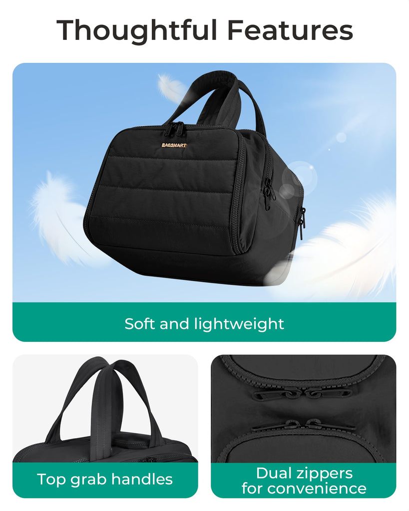 Brand: BAGSMARTColor: BlackFeatures: Large Capacity: Size - 11.8''L x 7.3''Wx 8.73'H. The travel toiletry bag with 4 compartments can perfectly organize your necessary travel toiletries and makeup storage Ultra Light and Soft Materials: Made of soft and luxurious Taslan fabric. This puffer toiletry bag feels like cotton candy, giving people...