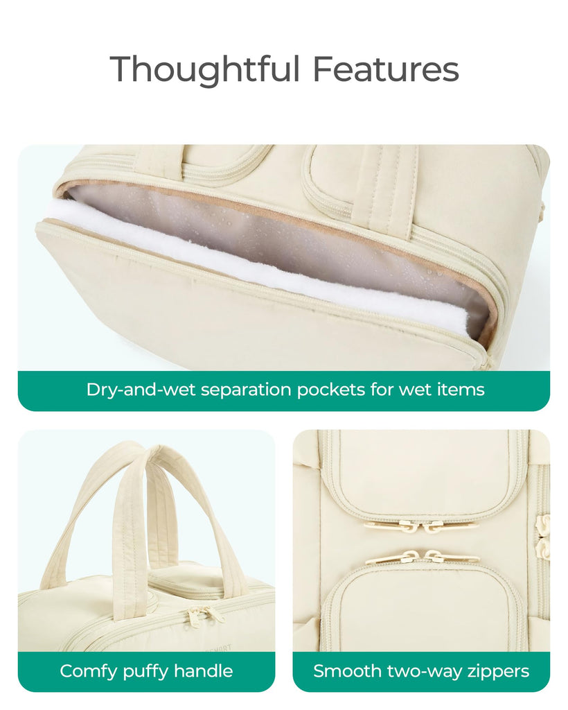 - Dry-and-Wet Separation: The large toiletry bag with a waterproof PVC fabric and a front zipper pocket can help keep wet and dry items separate and make it easy to clean.