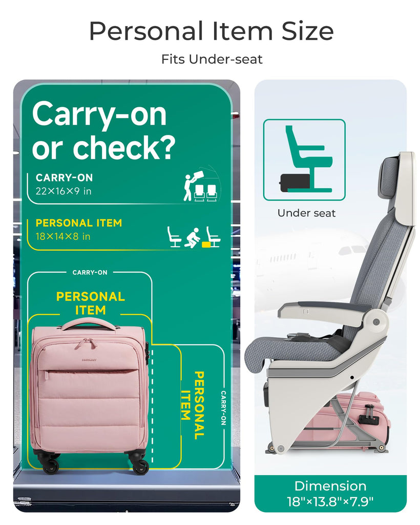 - Airline-Approved Freedom dimensions: 15.7"×13.8×7.9". No more baggage fees or overhead struggles. Our carry-on luggage perfectly fits under airline seats, keeping essentials close. For seamless boarding, avoid overstuffing the front pocket.