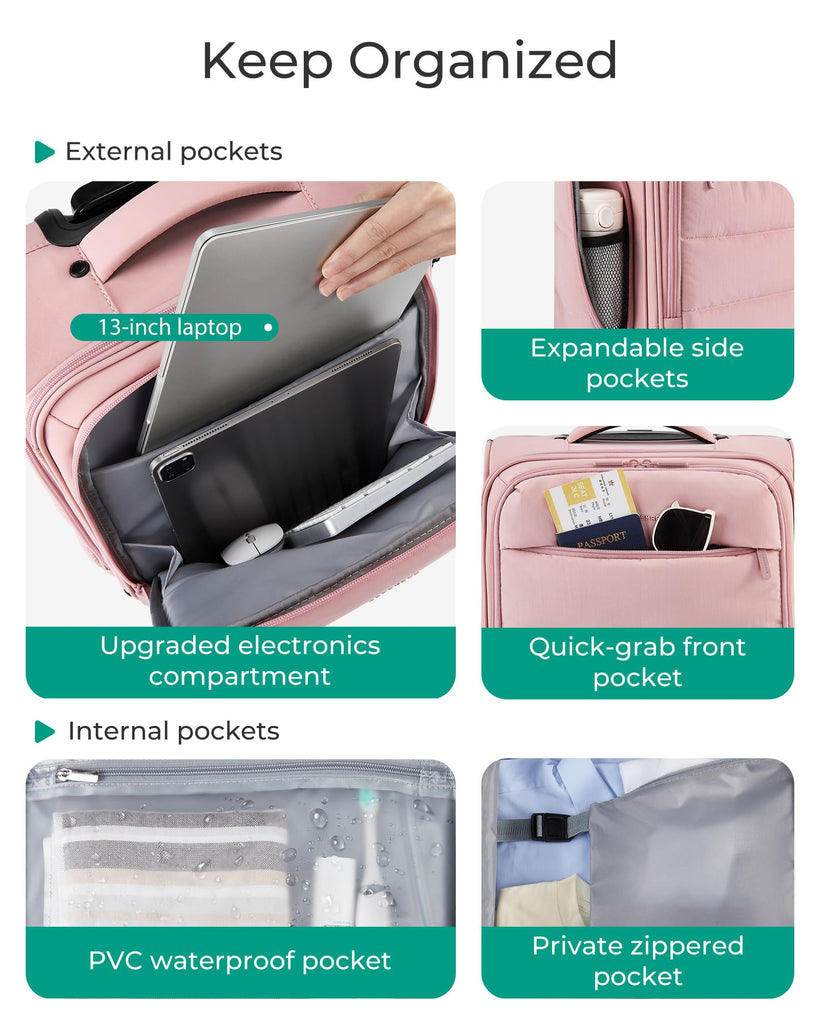 - CEO-Level Organization: Dedicated 13-14" laptop compartment and multiple compartments sort outfits from adapters. Waterproof zone for damp items. This carry-on suitcase turns packing panic into precision.