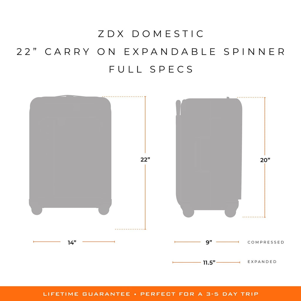 The ZDX 22” Carry-On Expandable Spinner offers 2.5” of expansion depth and still fits in an overhead compartment, making the difference between having to check a bag or not and saving time and money. Features such as an outside battery pocket so you can keep charging your phone, our Smartlink strap for connecting two bags and an easy-access pocket to hold items for security checkpoints are all designed to make your life on the road a lot smoother.
