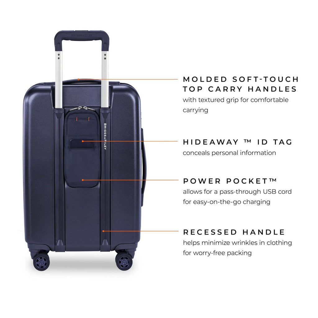 Brand: Briggs & RileyColor: NavyFeatures: CARRY-ON LUGGAGE - Measuring 16" x 14" x 8.5", this compact wheeled bag fits easily in overhead compartments or under seats, ideal for effortless travel and perfect for an overnight or weekend trip 360 SPINNER...