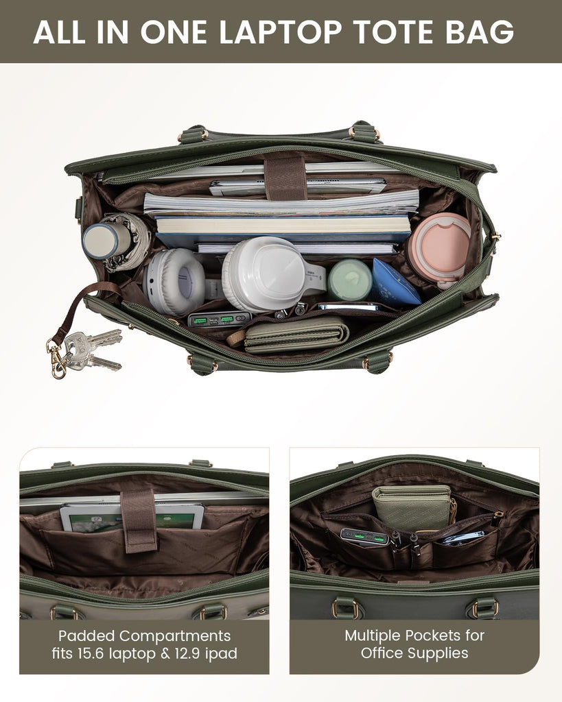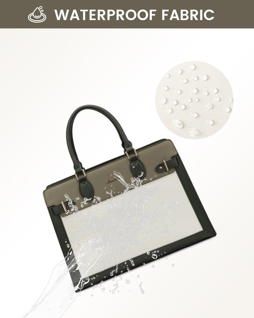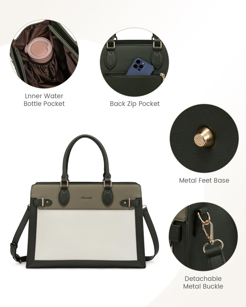 Brand: LOVEVOOKColor: Dark Green-light Green-beigeFeatures: 【Stylish Laptop Bag】Crafted from waterproof and durable PU leather,this laptop tote bag,offering a chic and professional appearance, is water-resistant,anti-wrinkle,scratch-resistant,and wear-resistant,making it perfect for working women. 【Multiple Pocket Tote Bag】Features a dedicated padded laptop compartment for laptops up to 15.6 inches, an iPad pocket, a main...
