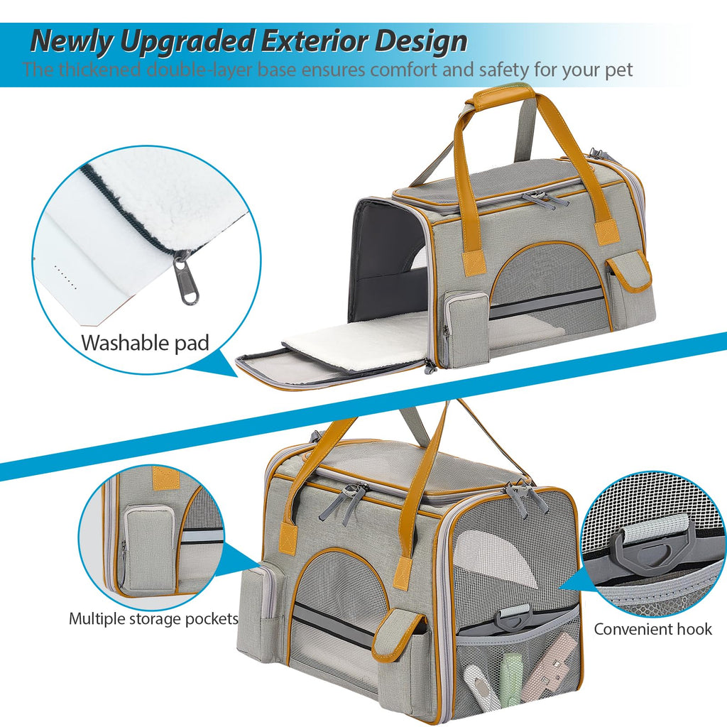 • Innovative Design: The pet carrier airline approved improves upon the single-functionality of previous products by adding storage pockets on the front and sides, combining aesthetics with practicality. The handle is made of soft synthetic leather material, making it more convenient and comfortable to use