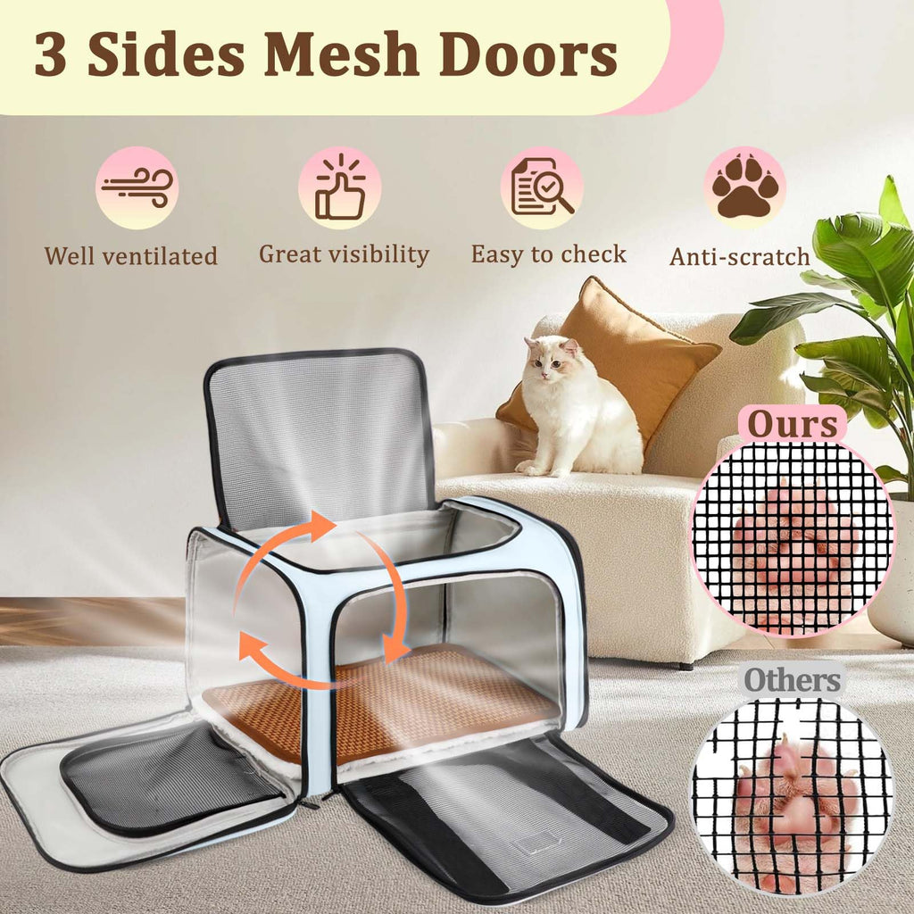 - 【Easy Loading, Breathable & Comfortable Cat Carrier】Experience the easiest pet loading ever with full zipper openings on all four sides. This revolutionary design allows contact from any angle for calming interaction, keeping your pet relaxed. The four reinforced mesh panels ensure maximum airflow and a panoramic view, keeping your pet cool, calm, and engaged—all while being scratch-resistant for lasting durability