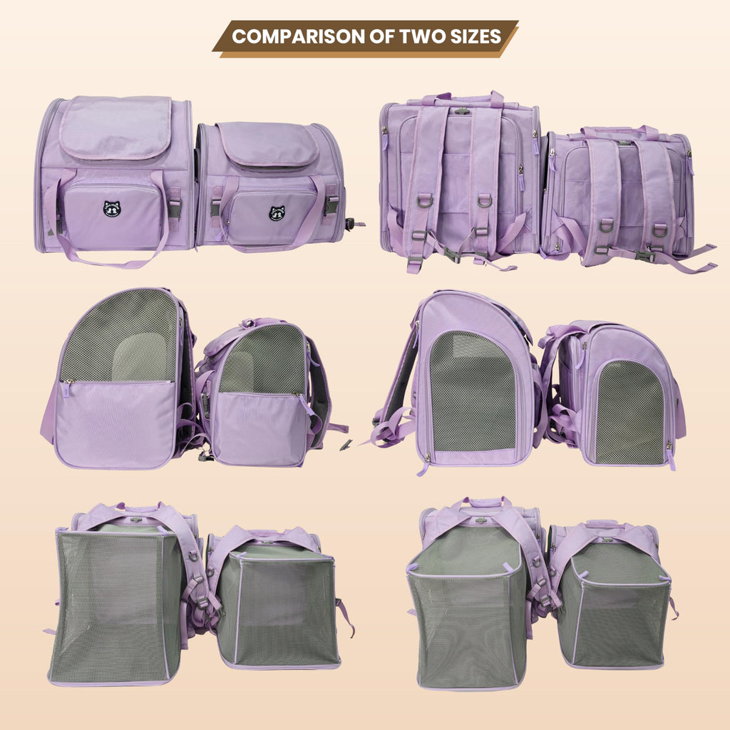 • Expandable Design – Perfect Size for Every Pet: Choose the right fit for your furry friend; Standard size (16.5"×9"×13.4") comfortably accommodates cats and small dogs up to 14lbs; while Large size (16.5"×10.2"×15.8") fits pets up to 22lbs—covering 95% of small pets. The innovative expandable back compartment instantly doubles interior space, giving your pet room to stretch, nap, or play during travel, hikes, or airport layovers. No more cramped quarters