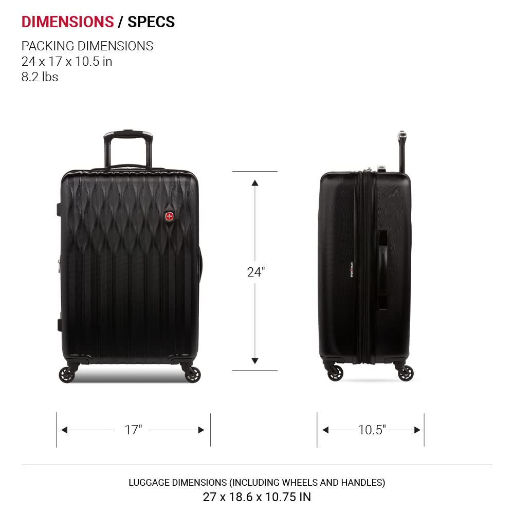 SwissGear 8018 Hardside Expandable Luggage with Spinner Wheels is the perfect bag for your next trip. This 24-inch suitcase is made of durable ABS and includes co-molded lift handle(s) with soft rubber hand grips for easy maneuverability. The split-case design expands 2" for additional packing space and a variety of internal pockets keep you organized. The eight 360-degree multi-directional spinner wheels and a premium, push-button steel locking telescopic handle make it easy to navigate through the airport. With outside dimensions of 27.75 x 19 x 10.5 inches including wheels and handles, this suitcase offers 24 x 17 x 10.75 inches of packing space. This hardside luggage is perfect for those who need a lightweight and durable suitcase for their travels. The hardshell exterior is designed to protect your belongings from the wear and tear of travel, while the spinner wheels make it easy to move around. The telescopic handle is designed to be comfortable and easy to use, and the internal pockets help you stay organized. Plus, this suitcase comes with a 10 year warranty against defects in materials and workmanship.