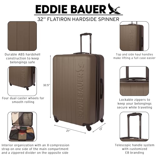 Brand: Eddie BauerColor: Dark FatigueFeatures: Durable ABS Hardshell Construction: The Eddie Bauer Flatiron Large Luggage is crafted with a tough ABS hardshell, offering excellent durability and protection for your belongings on any journey. (Built for long-lasting use and travel durability) Smooth Rolling with Dual-Caster Wheels: Equipped with four dual-caster wheels,...