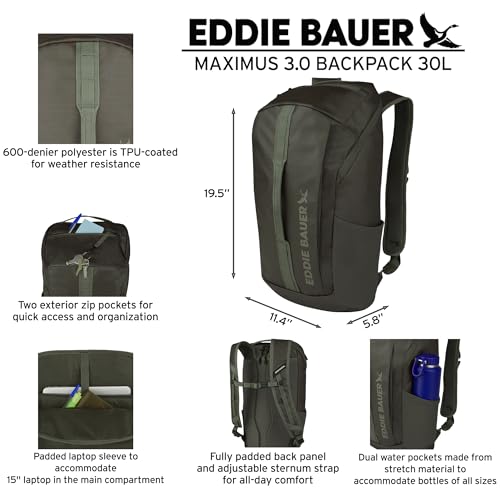 "The Eddie Bauer Maximus 3.0 Backpack is designed to meet the needs of adventurers, commuters, and s alike. Made with TPU-coated 600-denier polyester, this backpack offers exceptional durability and weather resistance, making it perfect for outdoor activities or everyday use. Organize your essentials with two exterior zip pockets for quick access, an interior zippered pocket for small items, and a spacious main compartment that includes a padded laptop sleeve for devices up to 15"". Stay hydrated with dual stretch water bottle pockets, and carry comfortably thanks to the fully padded back panel and adjustable sternum strap. Measuring 19.5"" H x 11.4"" W x 5.8"" D and weighing just 1.5 lbs, this 30L backpack is lightweight yet spacious enough to carry everything you need for work, , or travel. The front grab handle adds convenience for lifting or attaching gear, enhancing its versatility. Whether you're hiking in the mountains, commuting to work, or heading to class, the Eddie Bauer Maximus 3.0 Backpack offers a perfect blend of functionality, comfort, and durability. "