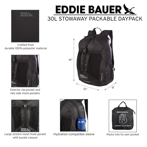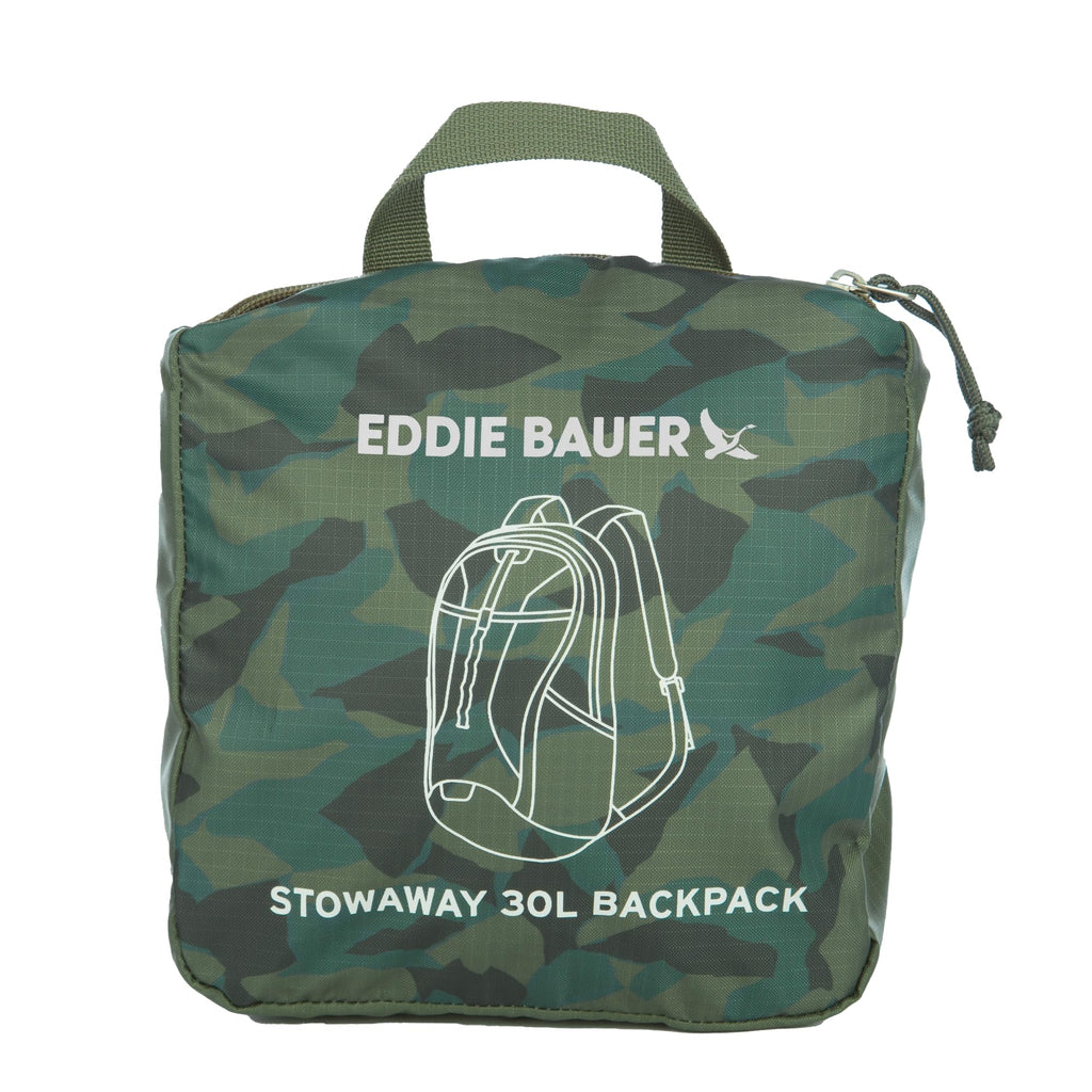 Eddie Bauer Stowaway Packable 30L Backpack Elevate your outdoor and travel adventures with the Eddie Bauer Stowaway Packable 30L Backpack. Lightweight yet durable, this versatile backpack is designed to offer exceptional comfort, functionality, and portability, making it your perfect companion for hiking, work, or daily use. Comfortable Design: The backpack features a mesh back panel and padded shoulder straps to ensure extended wear comfort. Its spacious interior includes a dedicated laptop sleeve and a hydration bladder portal for added convenience. Thoughtful Organization: With two mesh side pockets, you can keep water bottles or other essentials easily accessible. The main compartment provides ample space to organize your belongings, perfect for outdoor or urban settings. Compact Packability: When not in use, the backpack folds into its own pocket, measuring just 9" x 8" x 2.5". This innovative design offers a space-saving solution for travel and storage. Weather-Resistant Durability: Crafted from ripstop polyester, this backpack features a StormRepel WR finish, shedding moisture to keep your gear dry and protected, even in wet conditions. Sustainability Meets Style: Eddie Bauer combines adventure-driven innovation with eco-conscious practices, ensuring a sustainable and inclusive approach to outdoor exploration. Dimensions & Capacity: Open dimensions: 19" x 12" x 9". Volume: 30L. Lightweight at just 0.85 lbs, this backpack is ideal for carrying all your essentials with ease. Whether you’re trekking in the mountains, commuting in the city, or enjoying a weekend getaway, the Eddie Bauer Stowaway Packable 30L Backpack is your go-to solution for functionality, style, and convenience.