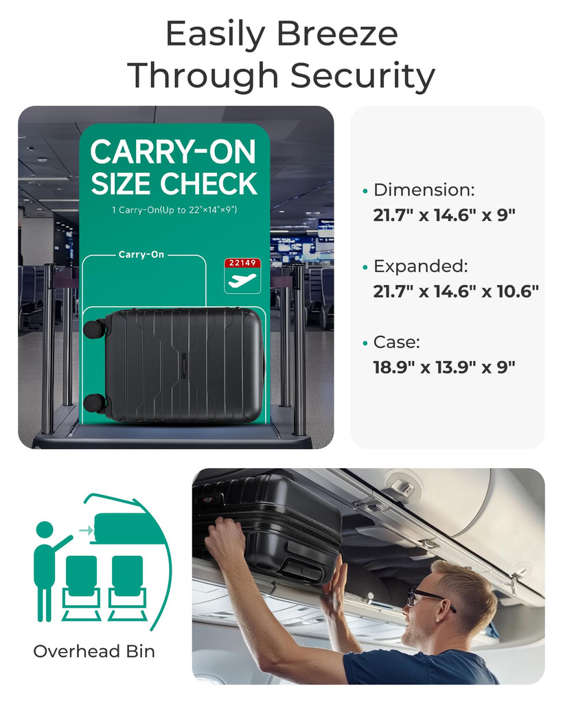 - Airline-Approved Boarding Size: 20 inch carry on luggage meets most airline requirements for overhead compartments. Suitcases with wheels are suitable for 3-5 day trips, air, train and bus travel. Travel luggage is upgraded with double-ended zippers and side-mounted TSA-approved locks to ensure smooth and hassle-free airline baggage screening for carry on suitcase measuring 22x14x9 inches. It has a volume of 35 liters and weighs only 6.83 lbs
