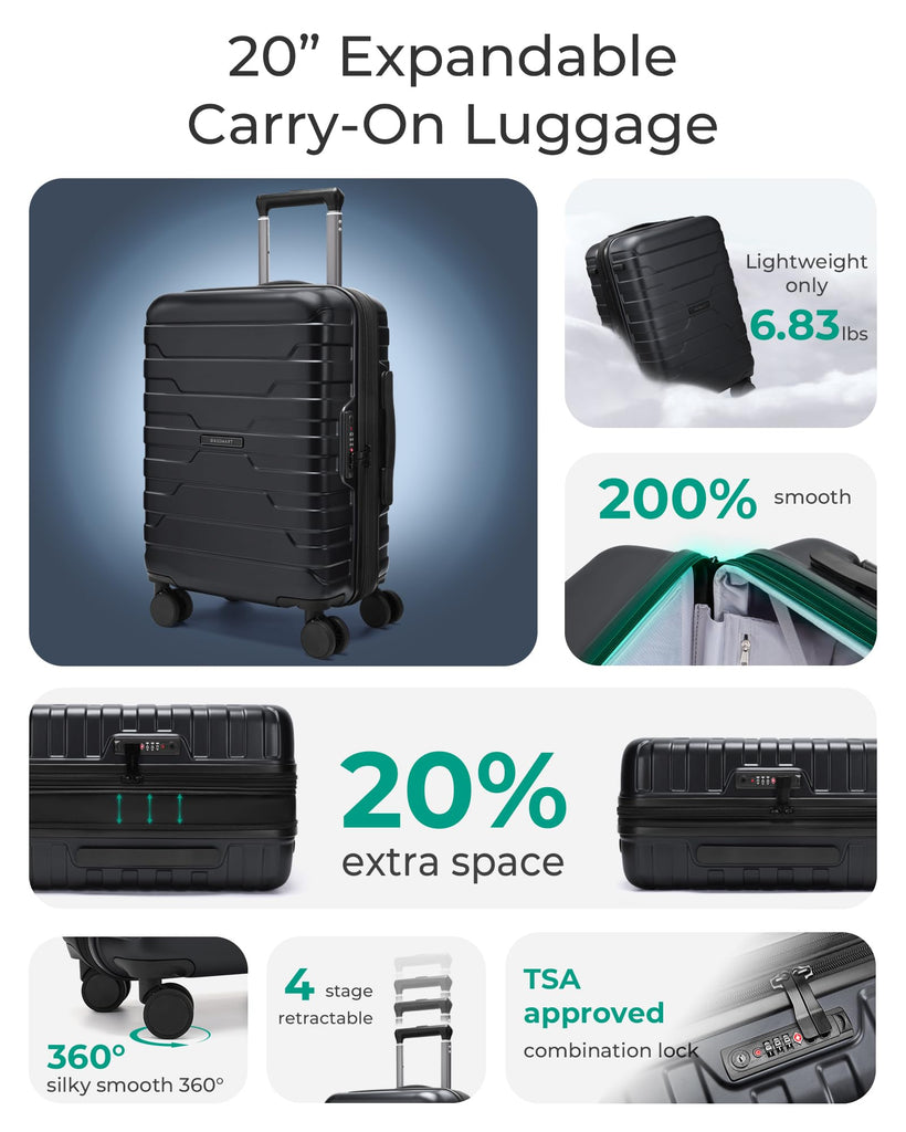 Brand: BAGSMARTColor: BlackFeatures: Airline-Approved Boarding Size: 20 inch carry on luggage meets most airline requirements for overhead compartments. Suitcases with wheels are suitable for 3-5 day trips, air, train and bus travel. Travel luggage is upgraded with double-ended zippers and side-mounted TSA-approved locks to ensure smooth and hassle-free airline baggage...