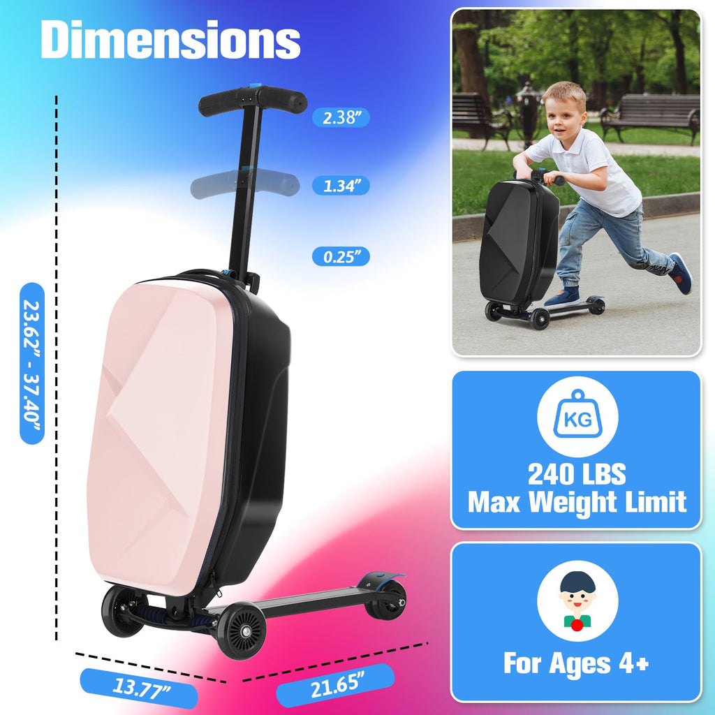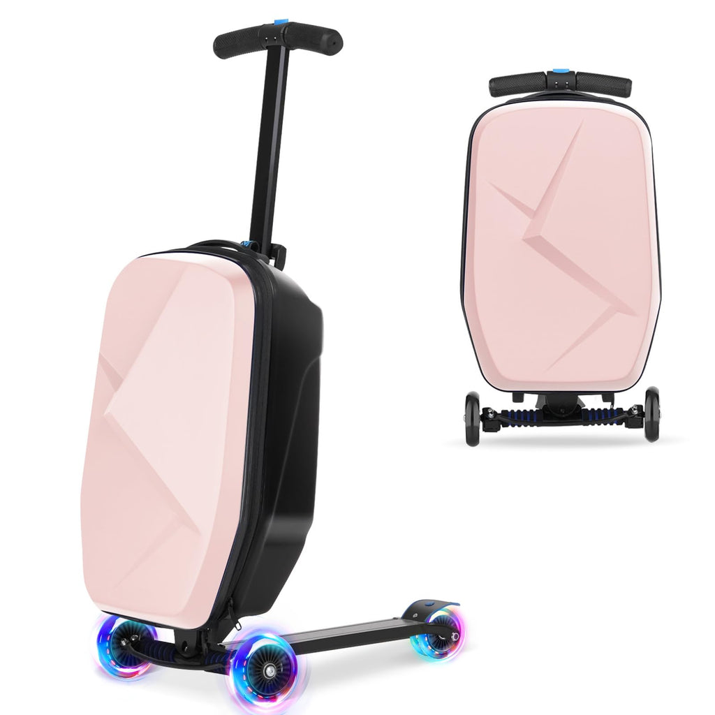 Scooter Luggage For Kids & Adults, Hardside Ride On Suitcase For Kids Ages 4-15 Multifunctional Lightweight Foldable Carry On Luggage With Wheels Ride On For Children Teenagers (Light Pink, 20")