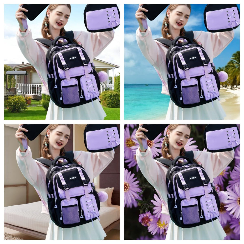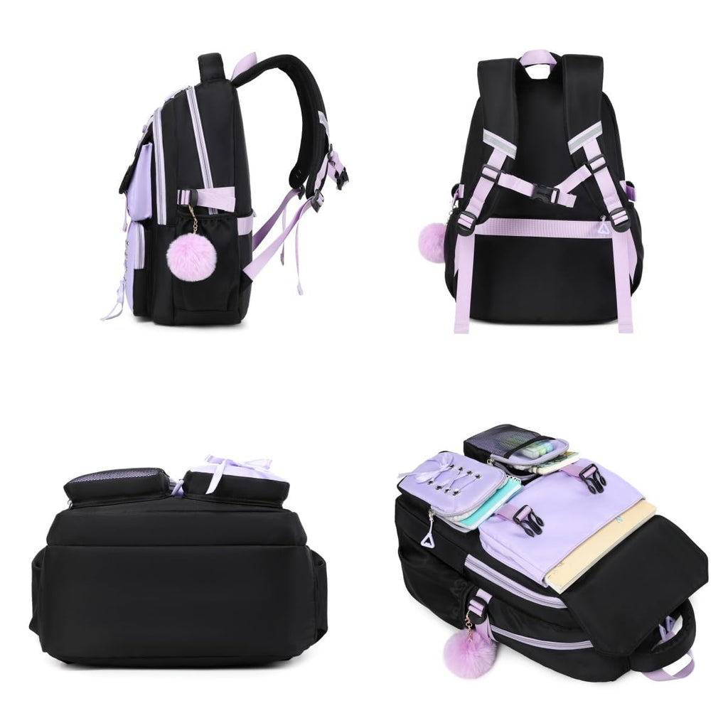 Miacollie Girls Backpack with Lunch Box and Pencil,Travel Daypack Cute backpack for Teens Girls Women Students (Black & Purple)