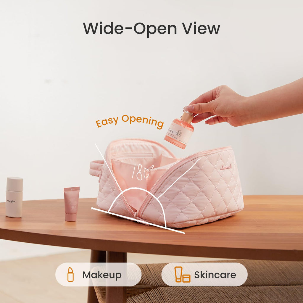 - 【Puffy&Machine-Washable Fabric】:Crafted from waterproof cloud-soft puffer material, this cosmetic travel bag combines durability with style. The crush-resistant padding protects fragile items, while the machine-washable fabric ensures effortless cleaning. Lightweight yet structured, it stands upright on countertops.