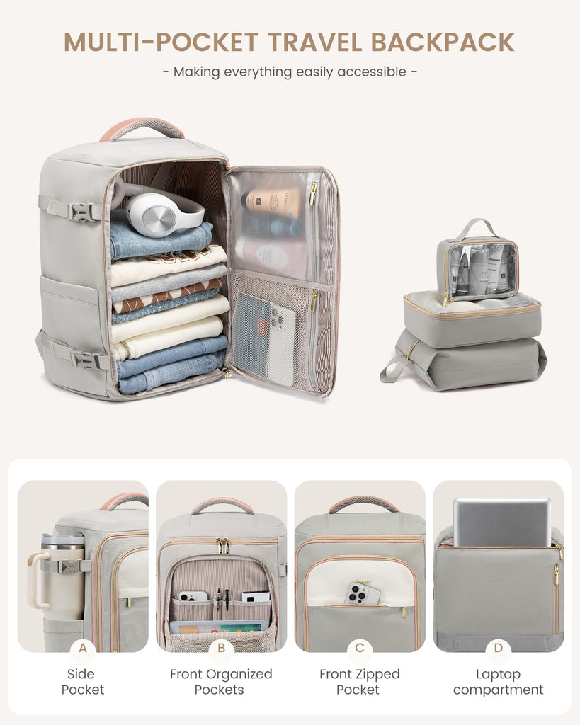 - Stay Organized & Travel Stress-Free:Meet the carry on backpack for airplanes that simplifies travel. As a travel backpack personal item size, it opens like a suitcase for easy packing and comes with a full organizer set (clear toiletry bag, shoe bag, and packing cube). The included clear toiletry bag is TSA-compliant and waterproof, ensuring you sail through security.