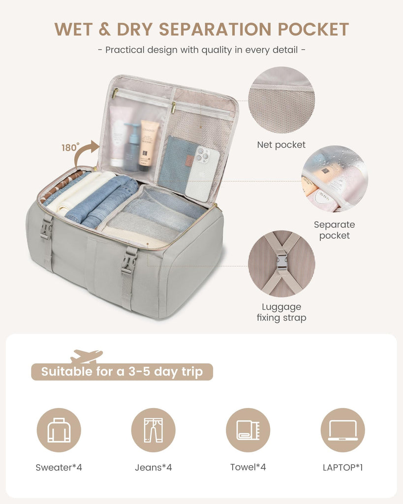 - Wet-Dry Separation for Smart Packing: Stay Organized On the Go. Meet your new favorite personal item travel bag. This backpack for traveling on airplane comes with a special pocket to isolate wet items like swimsuits, keeping the rest of your gear dry and organized. Perfect for any trip, ensuring versatile convenience everywhere.