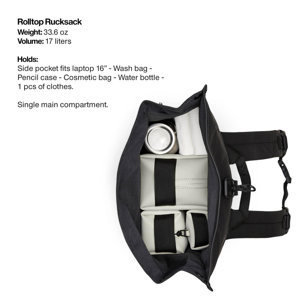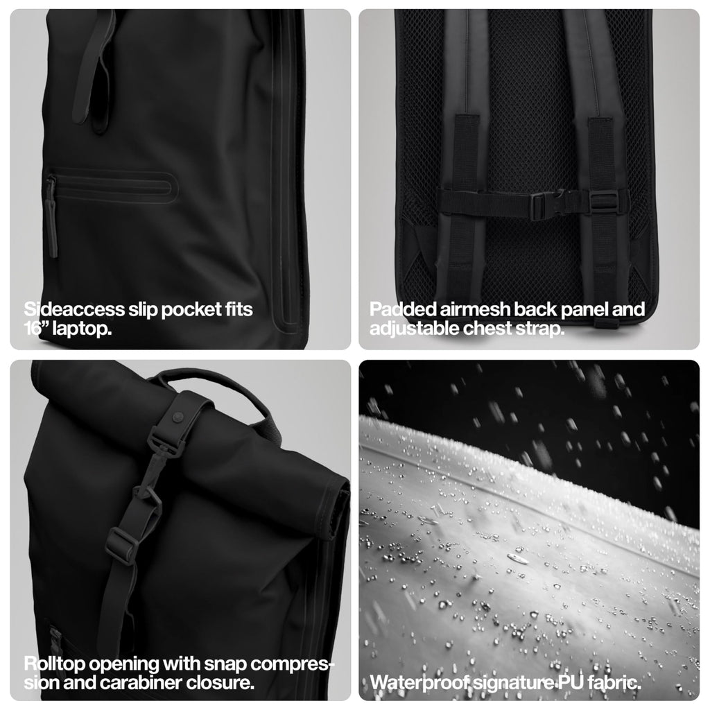 - RAINS SIGNATURE DESIGN: Minimalist rolltop silhouette embodies contemporary Scandinavian urban aesthetics. Matte black coated PU finish delivers sophisticated drape. Welded seams and concealed back-yoke vents create a clean, modern profile suitable for both men and women.