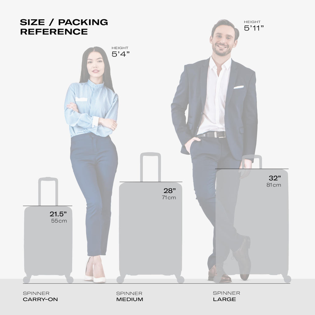 - FOUR, MULTI-DIRECTIONAL OVERSIZED SPINNER WHEELS for effortless mobility, re-engineered lightweight