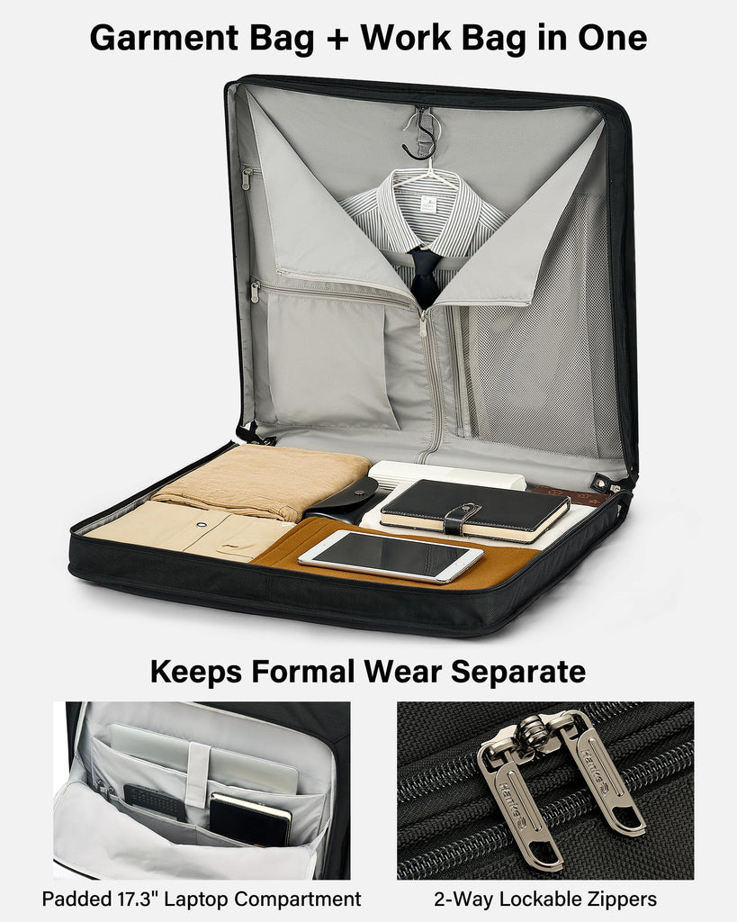 - 17.3" Laptop Compartment - Business Organizer: The front organizer section includes a padded 17.3-inch laptop pocket, document sleeve, and dedicated slots for pens, cards, and chargers. Keeps business essentials separate from clothing—ideal for travelers who need a garment bag + laptop bag combination in one streamlined design