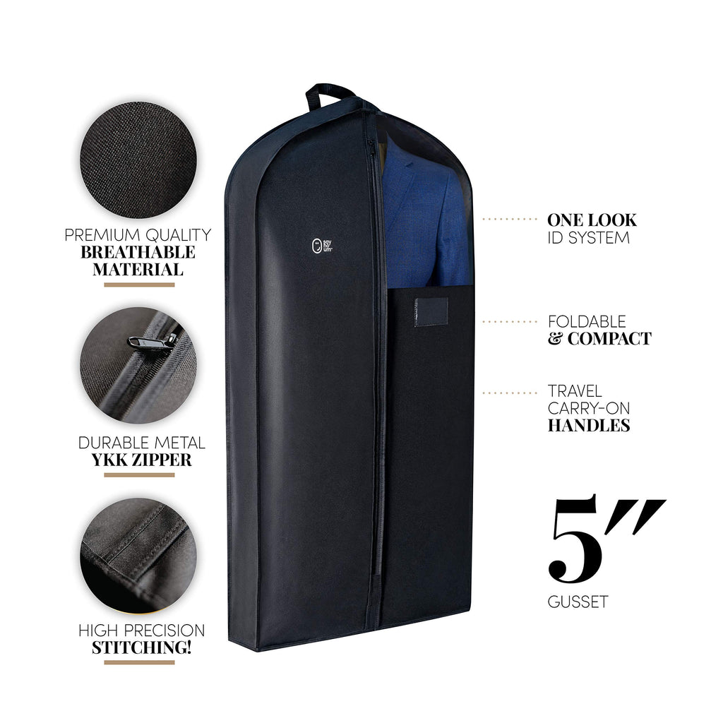 - GENEROUS GUSSET – our 47 inch + 5 inch gusset storage garment bag is designed to fit multiple suits, tuxedos and women dresses between 40-46” in length. Perfect for all types of men suits, casual and formal up to knee length women dresses and uniforms.