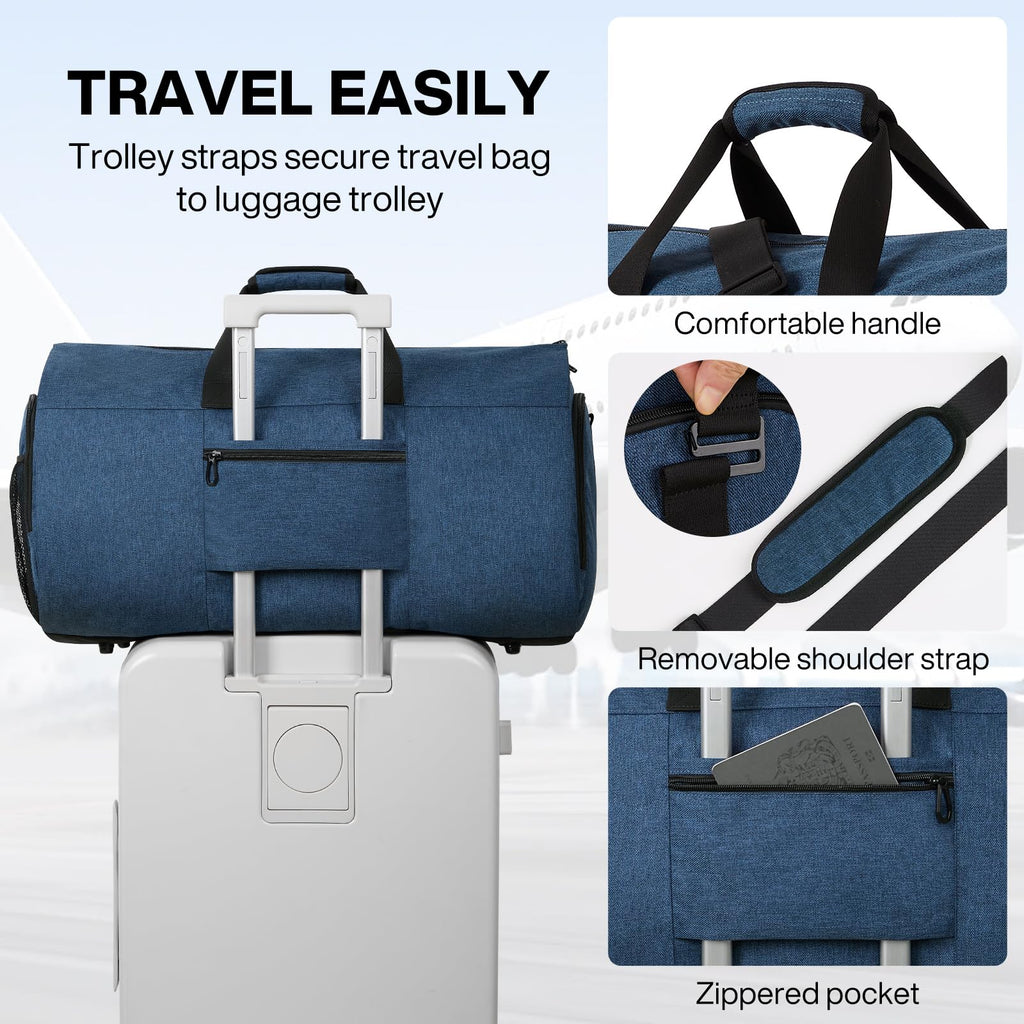 - [Quality & Versatile] Strict producing process and QC standard ensure this travel garment bag's high quality performance. Detachable and adjustable shoulder strap with soft padding, you can use it as handbag, shoulder bag or cross bag as you like. This travel bag can be strapped to the trolley handle to free your hands. Perfect for the modern traveler looking for style and functionality