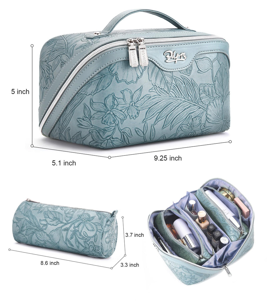 Brand: BOYATUColor: 01-Light BlueFeatures: Floral Travel Makeup Bag Set of 3: This large capacity travel makeup bag with compartments can fit full-sized skincare bottles and full-sized toiletries for over 5 days trips or vacation. It will come with two small makeup pouches, which keep your skincare products and cosmetics organized...