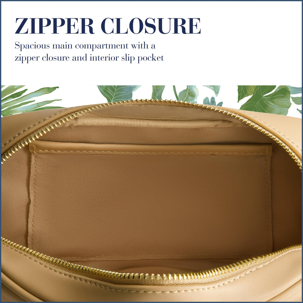 - STYLISH CROSSBODY BAG: This chic crossbody bag features a sleek tan faux leather exterior with an embossed pineapple and Tommy Bahama logo. Features a sleek gold hardware and zipper closure, the timeless design adds elegance to any outfit, perfect for both casual and formal occasions