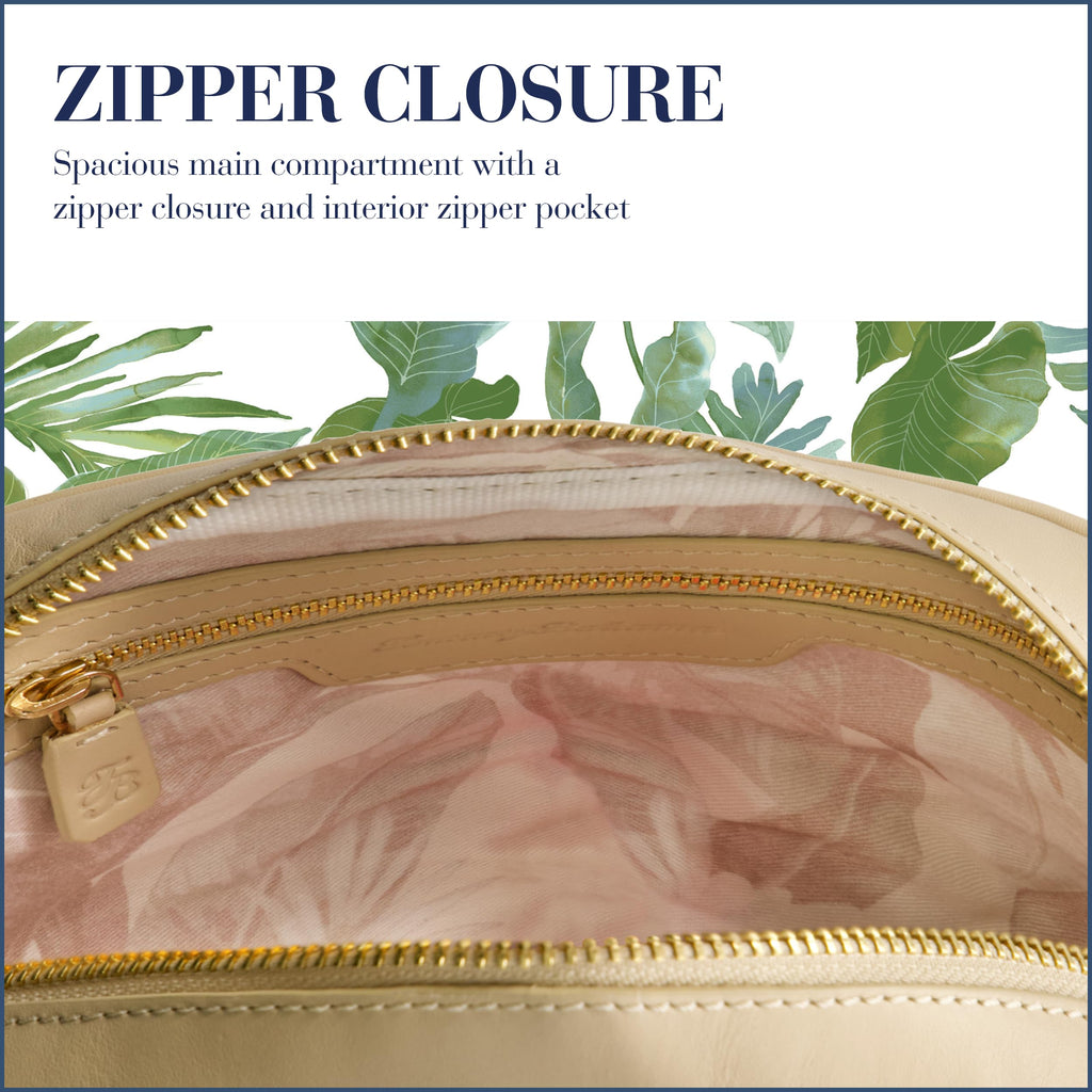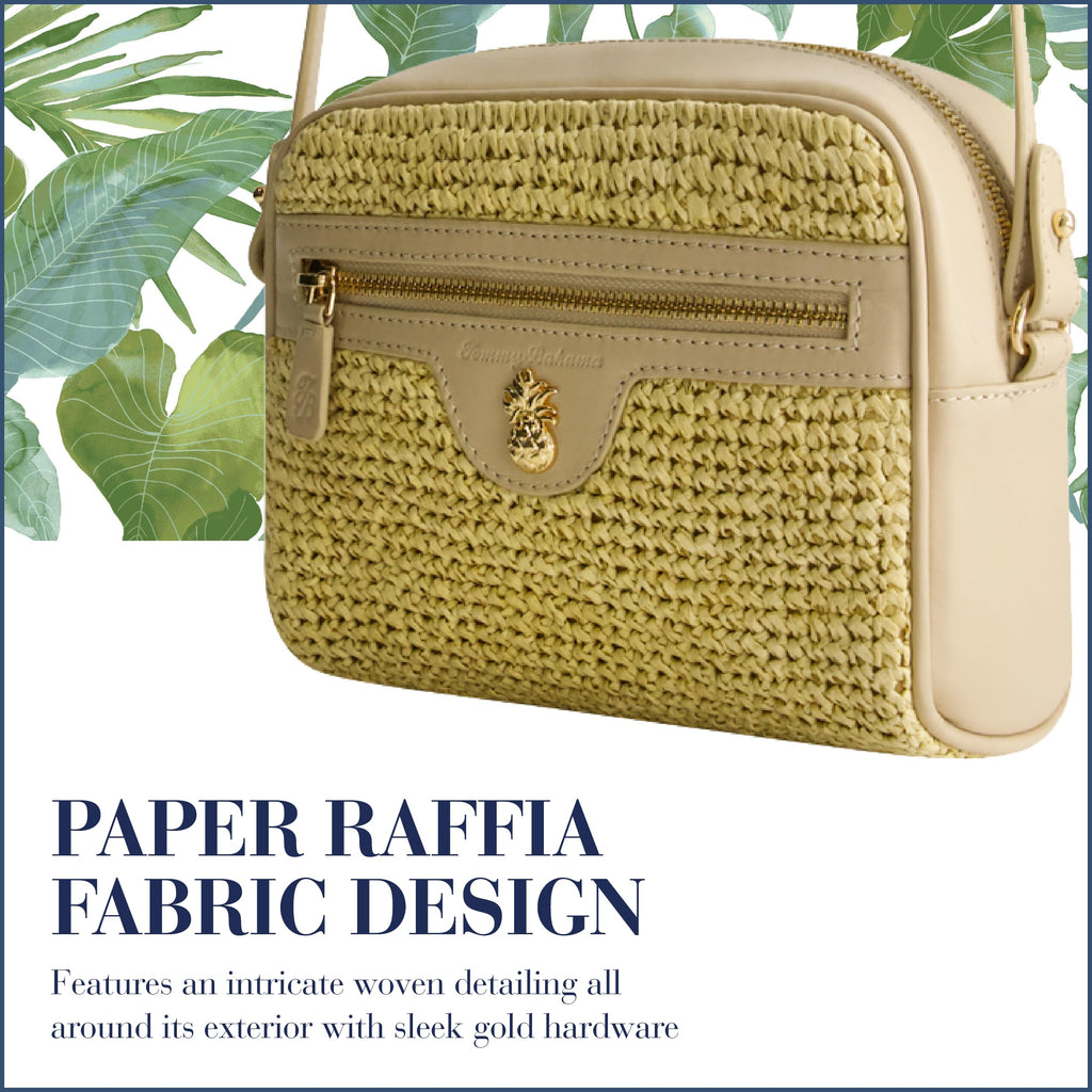 Elevate your style with this chic crossbody bag featuring intricate woven detailing across its exterior, complemented by sleek gold hardware and a zipper closure for a timeless design that suits both casual and formal occasions. The removable shoulder strap with a drop of 18 to 21 inches offers convenience, while the compact size is perfect for carrying essentials like your phone, wallet, and keys without added bulk. Made from lightweight paper raffia fabric, it combines everyday durability with effortless style. Officially licensed Tommy Bahama merchandise ensures quality craftsmanship. Dimensions: 6 H x 8.5 W x 2.5 D inches.