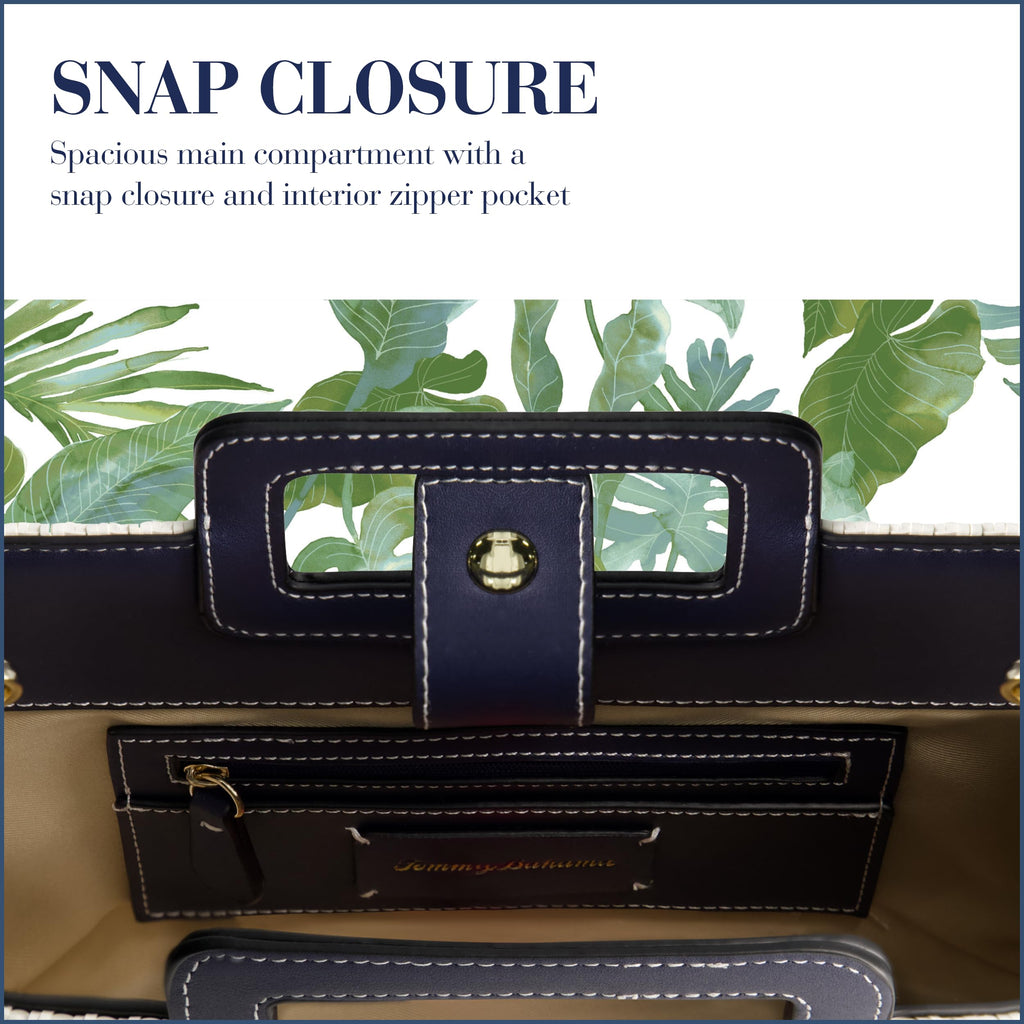 Add effortless style to your everyday look with this casual tote bag featuring intricate woven detailing and leather accents, complete with gold hardware for a chic, laid-back vibe. Designed for convenience, it includes a removable shoulder strap with a 20 to 23-inch drop and a spacious main compartment with a magnetic snap closure for essentials like your phone, wallet, and books. An inner zip closure adds extra security. Made from durable polypropylene and polyester, this lightweight bag is built for daily use. Officially licensed Tommy Bahama merchandise ensures premium quality. Dimensions: 7.75 H x 10.25 W x 4 D inches.