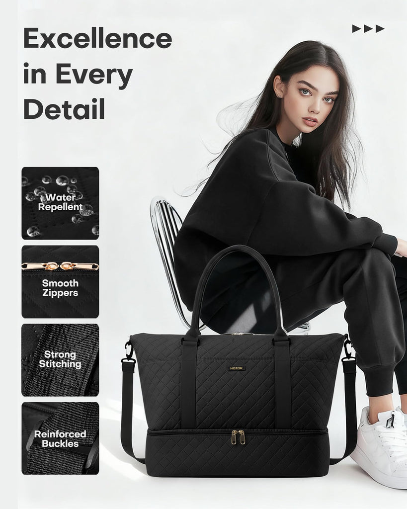 - EXCELLENCE IN EVERY DETAIL: Every detail is thoughtfully built for durability and style. This gym bag for women is water-resistant and wear-proof, made with innovative 3D Quilted Oxford fabric. Smooth two-way zippers ensure smooth use, while reinforced stitching guarantees long-term reliability. In addition, the comfortable carry handles and an adjustable shoulder strap add versatility and ease to every journey.