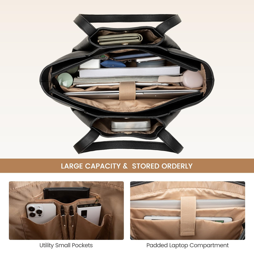 LOVEVOOK Work Tote Bags for Women - PU Leather Laptop Tote Bag for Women with Clutch, Large Capacity Office Purse Computer Briefcase for Casual Business Travel, Black