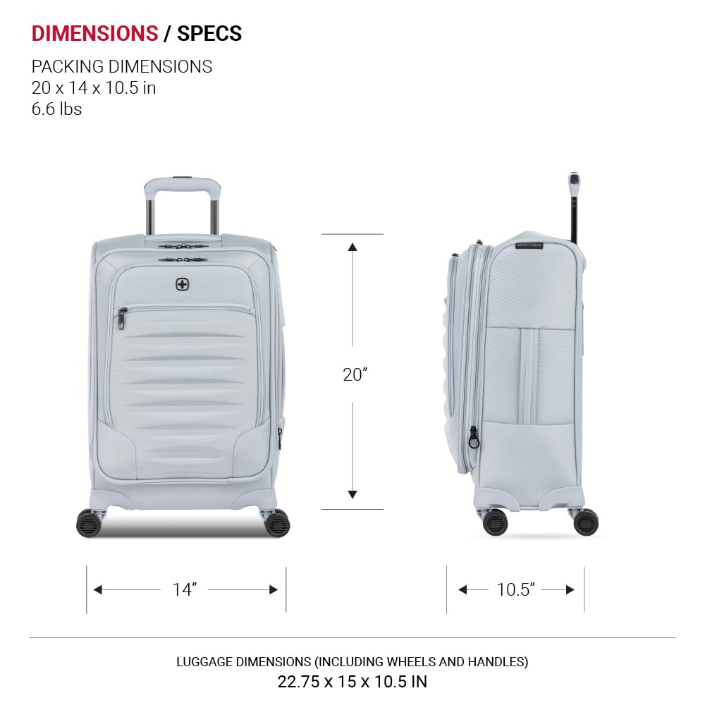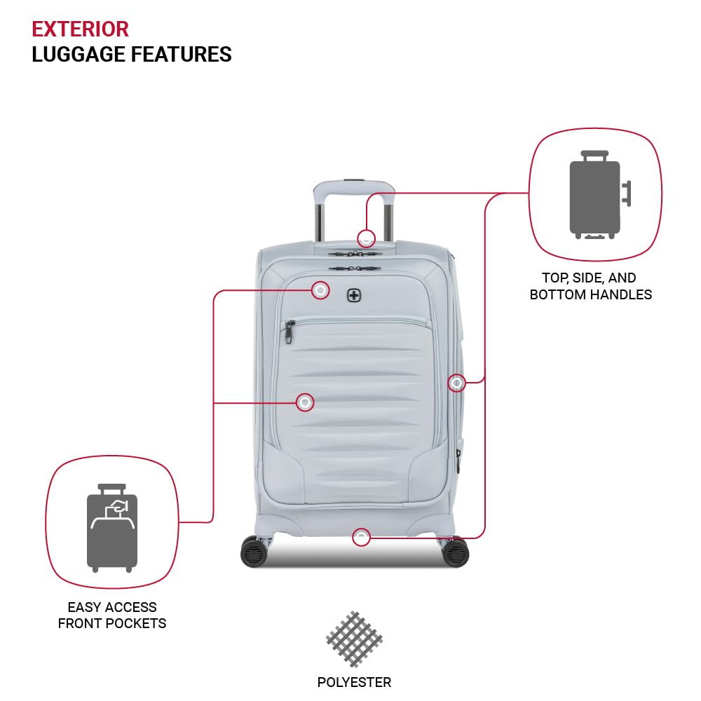 Every inch counts when it comes to fitting last minute gifts into your luggage. The SwissGear Opulence Expandable Spinner Luggage Collection luggage--expands to give you an ample amount of packing space when needed. This luggage features a locking push/pull telescope handle system and eight 360-degree multi-directional spinner wheels for convenient portability. Made from a durable, scuff-resistant polyester fabric, its interior is fully lined and features adjustable luggage tie-down straps for securing garments in place, a removable zippered wet bag, a large mesh lid pocket, and a packing pocket for holding small items and accessories. With the convenience of two front panel pockets, a built-in ID tag, and padded top and side handles, this ergonomically expandable luggage was designed with comfort, function, and strength in mind