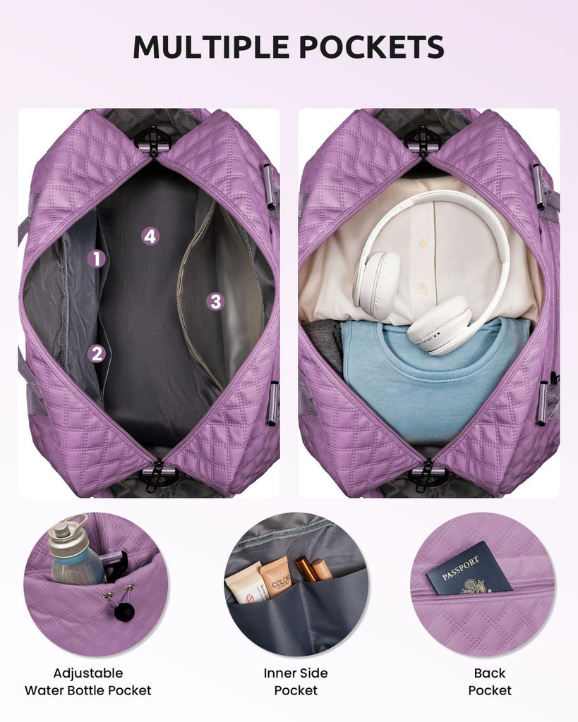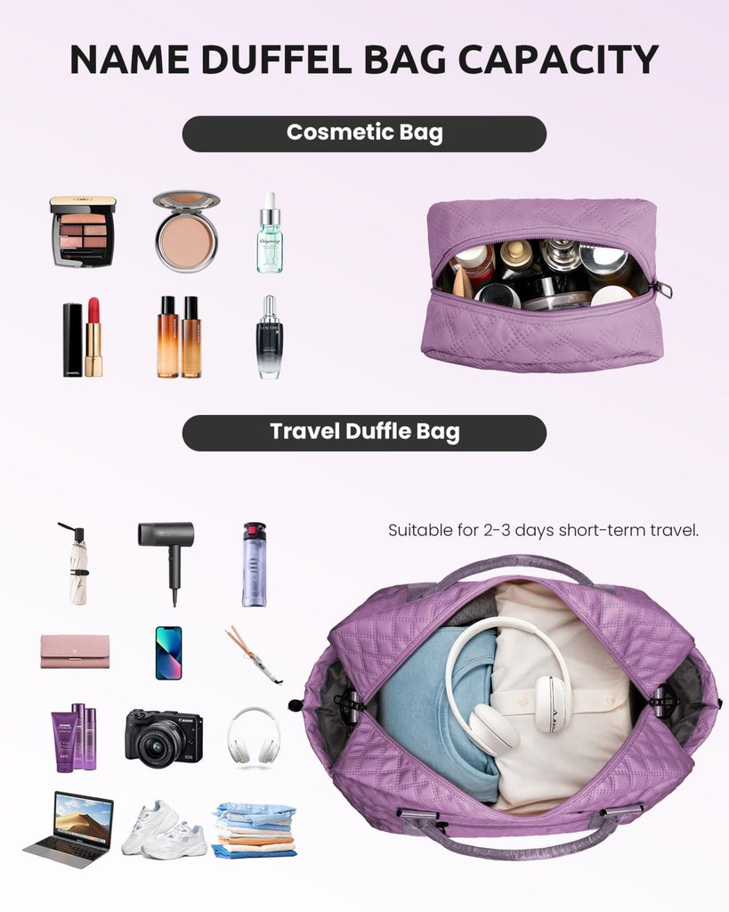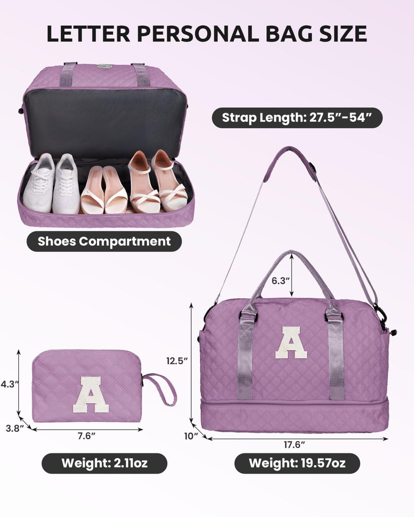 Brand: VogewoodColor: PurpleFeatures: 【Initial Weekender Bag&Cosmetic Bag】Our weekend bag stands out from the market with personalized letters, allowing you to choose the initial of your name or give it as a thoughtful gift to others. Our initial travel bag comes with a cosmetic bag for storing your makeup/toiletries. 【Airplane Friendly...