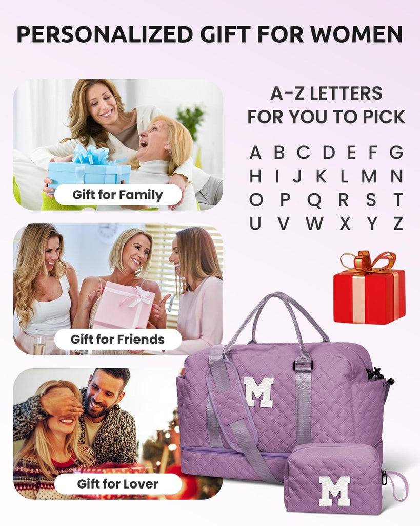 - 【Initial Weekender Bag&Cosmetic Bag】Our weekend bag stands out from the market with personalized letters, allowing you to choose the initial of your name or give it as a thoughtful gift to others. Our initial travel bag comes with a cosmetic bag for storing your makeup/toiletries.