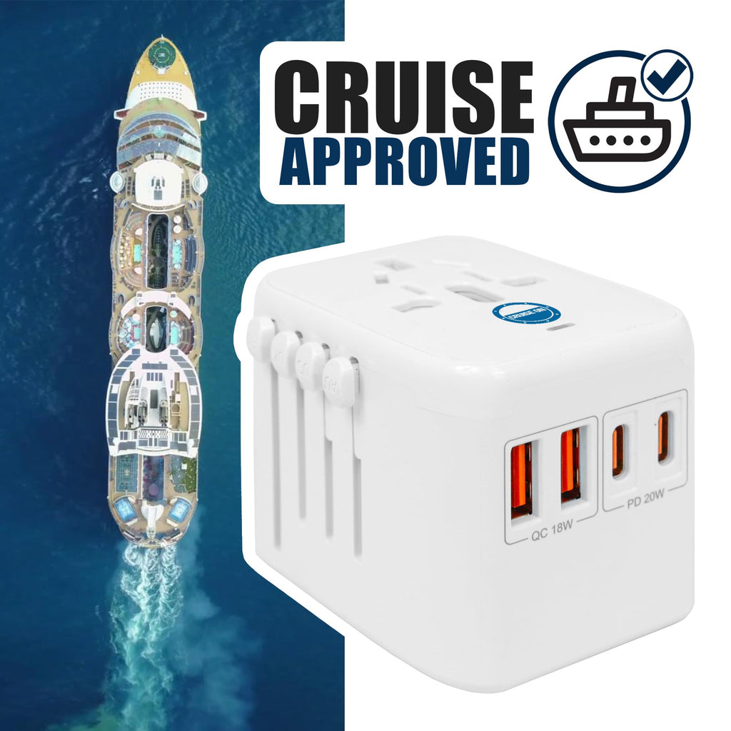 Cruise On Universal Travel Adapter, Cruise Approved (incl Royal Caribbean, Disney, MSC) - International Power Adapter [2 USB-C, 2 USB, AC] World Travel Plug Adapter Converter USA, Italy, Europe, Asia