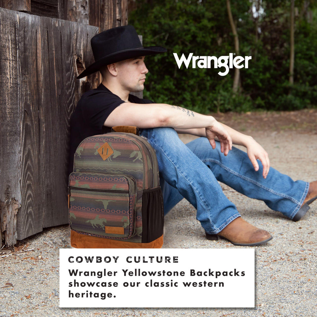 - Wrangler Yellowstone backpack is built for practical use while offering modern style. Equipped with carefully designed interior and exterior pockets, this convenient and comfortable pack keeps your laptop and supplies secure