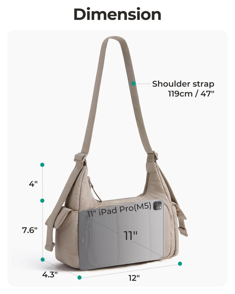 - Dimensions: 12×4.3×7.6 in / 30×11×19 cm, max size to 11" iPad Pro. Generous crossbody space - With a long 28-47" adjustable strap and 4" top-to-strap clearance, this puffer bag sits comfortably without feeling cramped