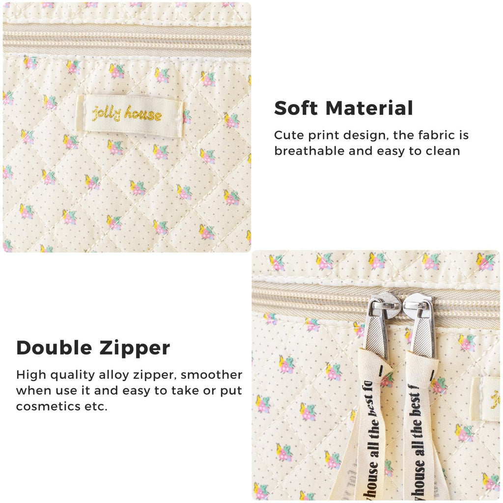 - HIGH-QUALITY MATERIAL - This quilted makeup bag is made of cotton material, which is easy to clean, and has been well-stitched and reinforced at all stress points. The double zipper is made of high-quality gold-plated alloy, which can make the makeup bag easier to pull and align neatly.