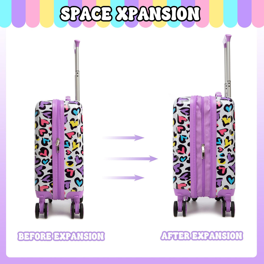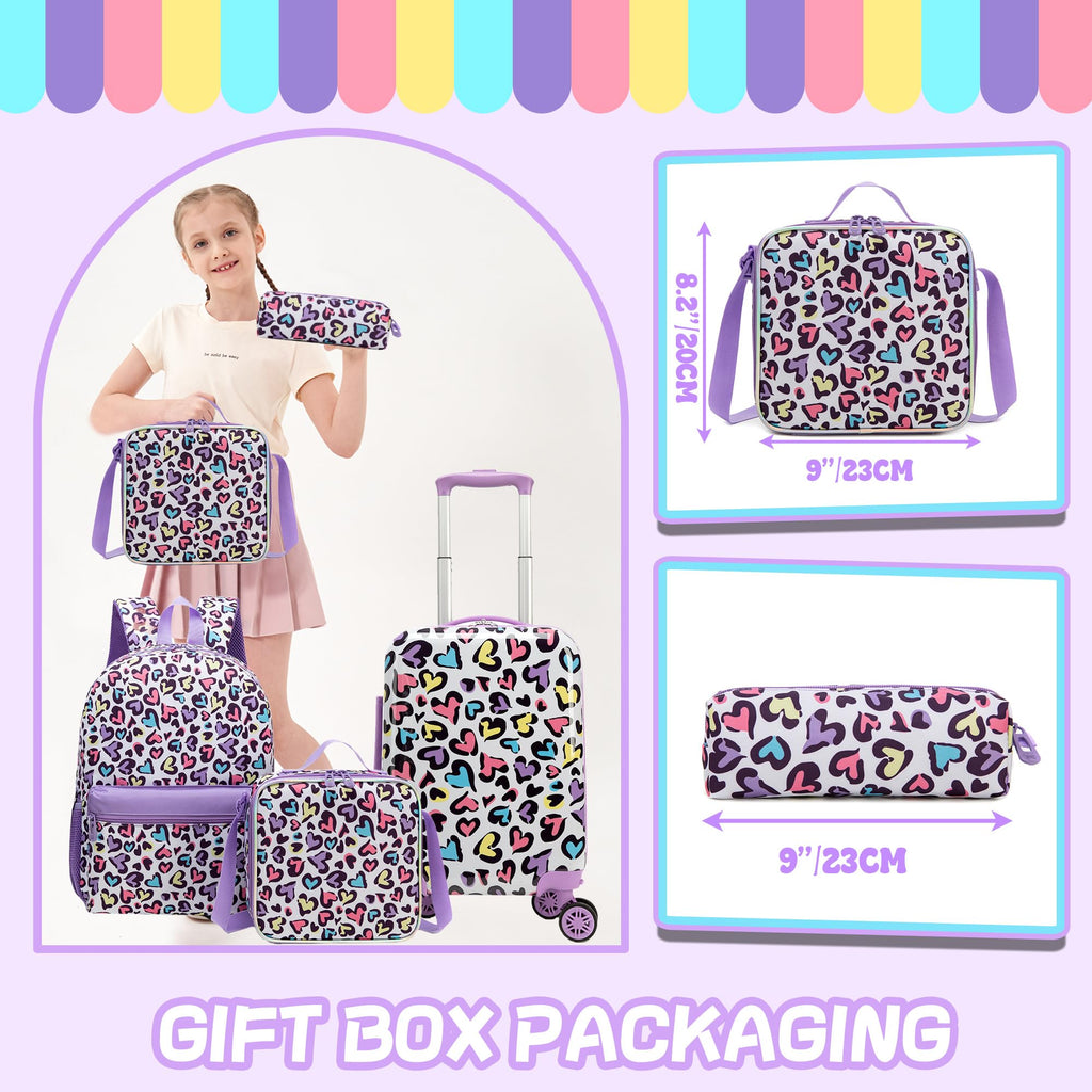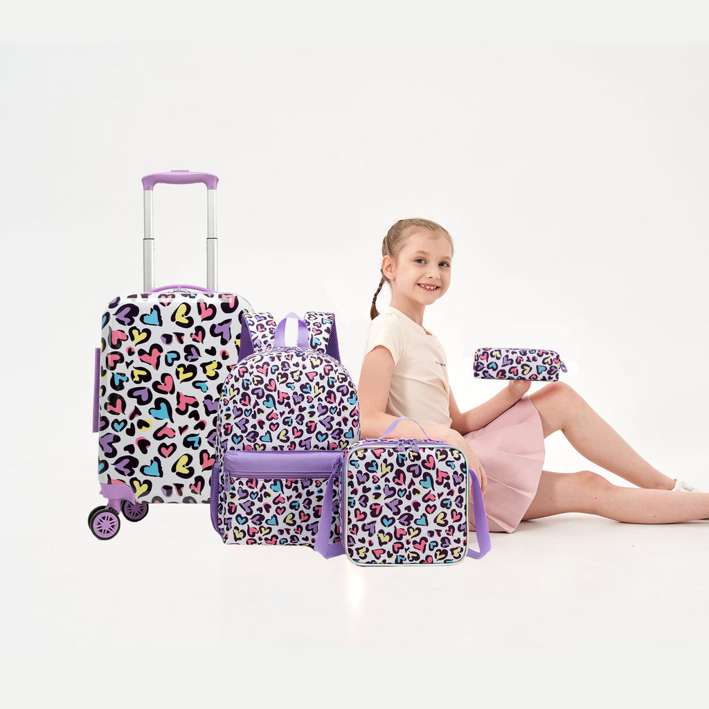 • 5-in-1Kids' Luggage Set: Everything a kid/teen girl needs for school and trips! This set includes a 16" kids luggage with wheels, a stylish backpack, an insulated lunch bag, a pencil case, a cozy neck pillow, plus a free luggage tag.