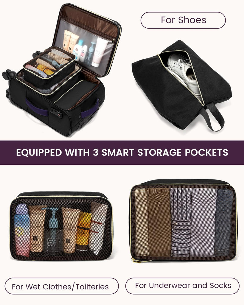- 【Smart Packing Features】This suitcase with wheels includes 3 bonus storage bags (shoe bag, clothes pouch, toiletry bag) and a wet compartment for damp items. It keeps your packing neat, organized, and protected for both short and long journeys.